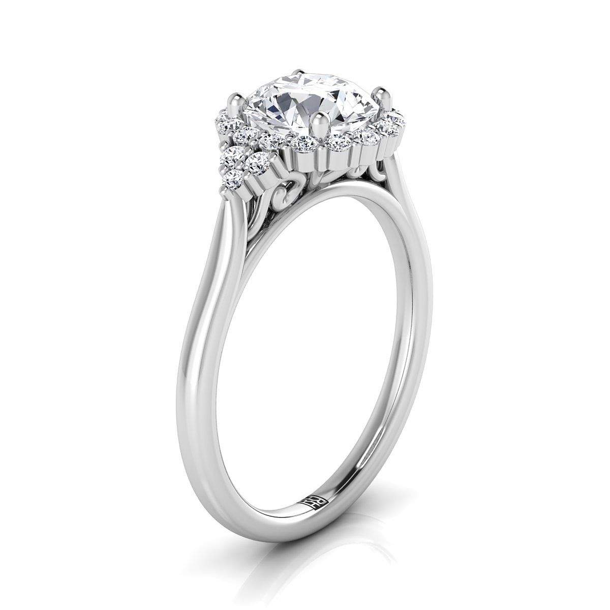 แหวนหมั้นประดับเพชรทรงกลมเจียระไนแบบ Brilliant ขนาด 18K สีทองขาว พร้อมลวดลายข้างแบบสามชิ้นและลายม้วน -1/4ctw