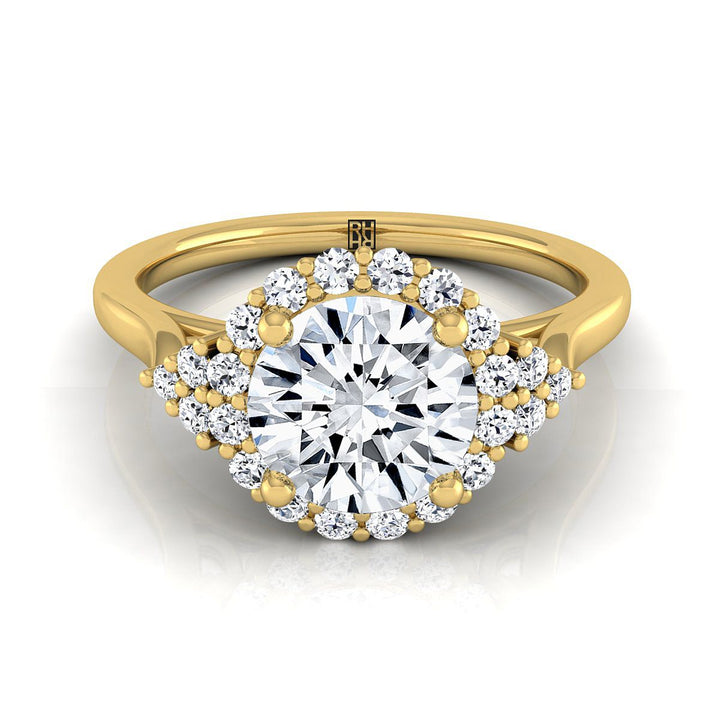 แหวนหมั้น Halo Pave ที่โดดเด่นด้วยสไตล์นี้ แสดงให้เห็นเพชรเจียระไนแบบ Brilliant Cut (h-i/vs 0.25ctw) ที่สวยงามซึ่งถูกประดับอย่างลงตัวในตัวเรือนทองคำ 18k สีเหลืองคลาสสิก