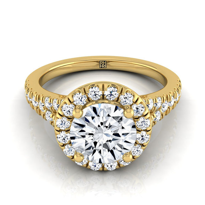 แสดงสไตล์อย่างสง่างาม แหวนหมั้น Halo Pave นี้นำเสนอเพชรเจียระไนแบบ Brilliant Cut (h-i/vs 0.50ctw) พร้อมกับแถบแยกแบบ Pave ที่ประณีต ติดตั้งในตัวเรือนทองคำเหลือง 14k