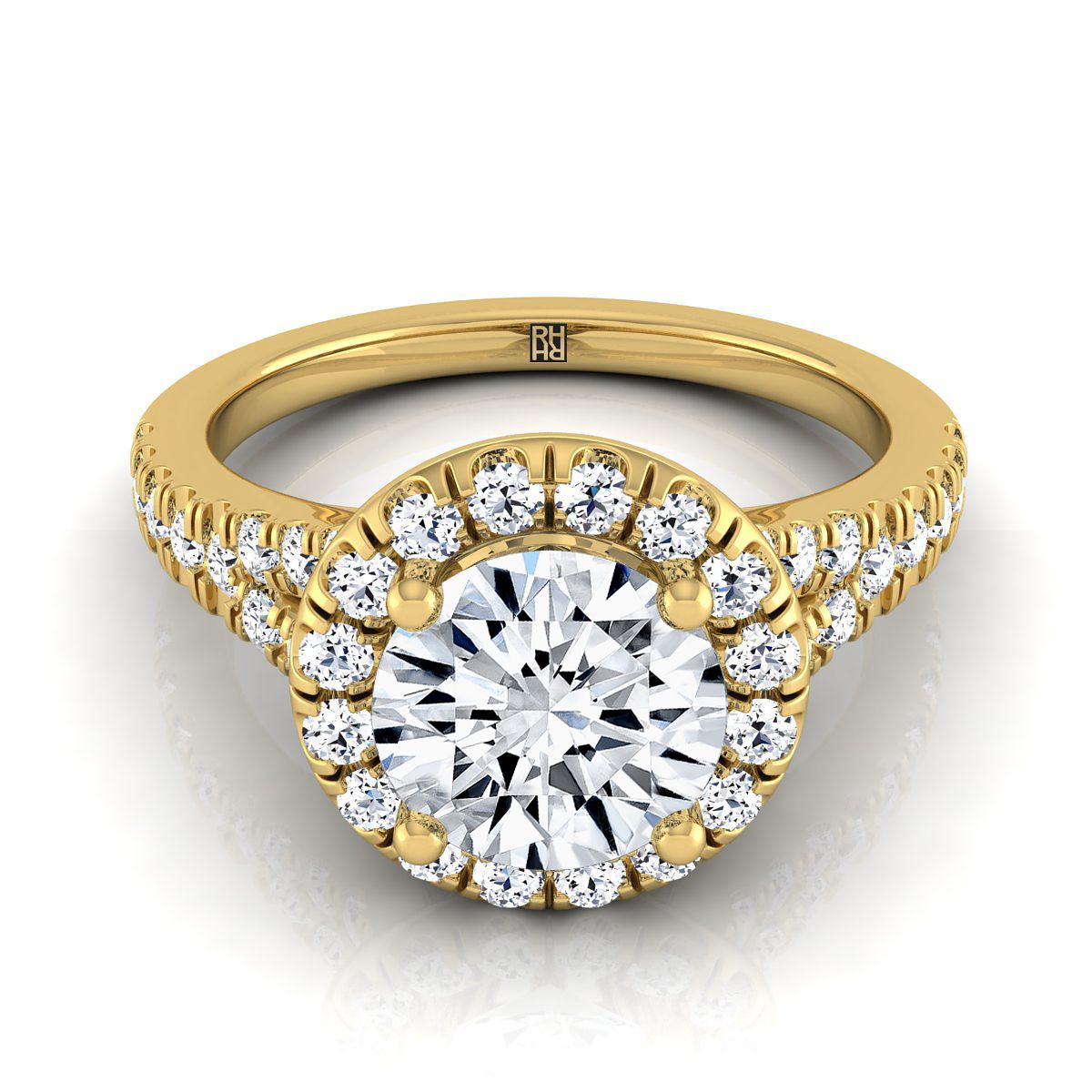 แหวนหมั้นเพชรทรงกลมเจียระไนแบบเรียบง่าย 18K ทองคำเหลือง พร้อมฮาโลแบบหนามเตยและก้านแยกเล็กประดับเพชร 1/2ctw