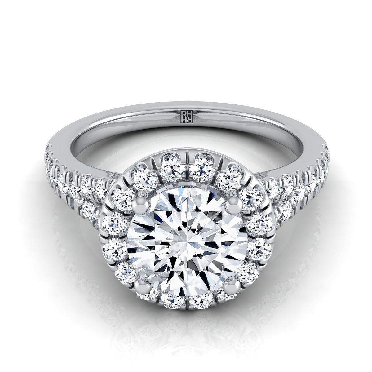แหวนหมั้นเพชรทรงกลมเจียระไนแบบเรียบง่าย ประดับด้วยกรอบเพชรแบบ Halo และขาแหวนแยกเล็กน้อยแบบ Pave น้ำหนักรวม 1/2 กะรัต