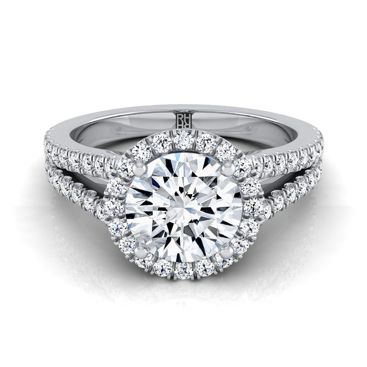 แหวนหมั้น Halo Pave ที่ทำด้วยมืออย่างประณีตนี้ โชว์เพชรเจียระไนแบบ Brilliant Cut (h-i/vs 0.45ctw) ที่ประดับอย่างสวยงามในตัวเรือนทองคำขาว 14k คลาสสิก