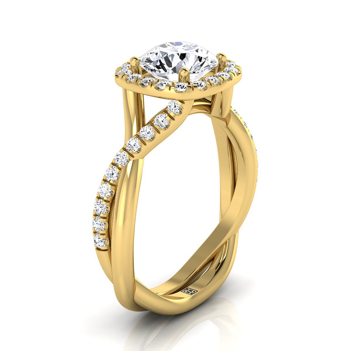 แถลงการณ์สไตล์ที่สง่างาม แหวนหมั้น Halo Pave นี้พร้อมก้านบิดแสดงเพชรเจียระไนแบบ Brilliant Cut (h-i/vs 0.45ctw) ที่ตั้งไว้อย่างสวยงามในตัวเรือนทองคำเหลือง 18k คลาสสิก