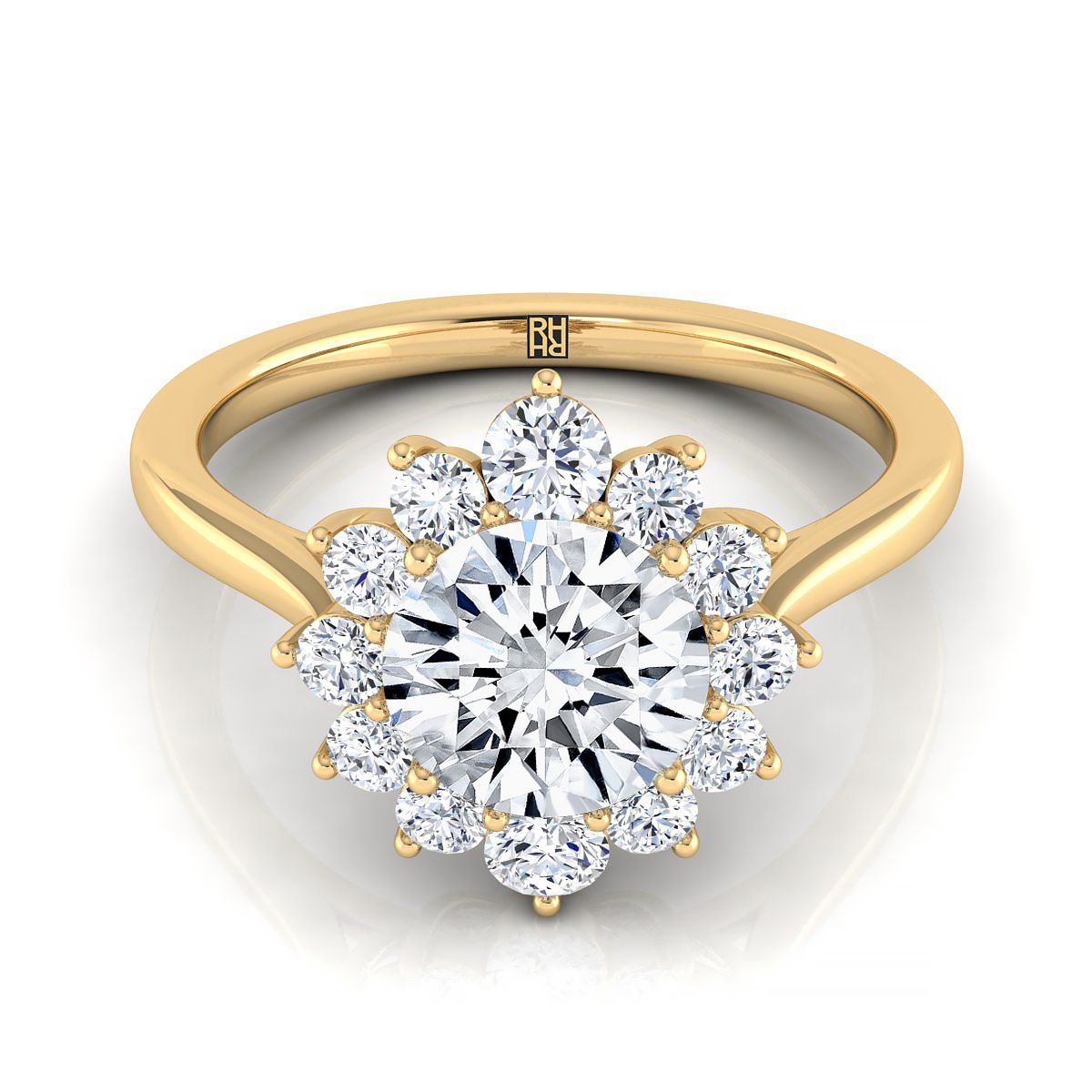 แหวนหมั้นดอกไม้เพชรฮาโลว์ที่โดดเด่นด้วยเพชรเจียระไนแบบ Brilliant Cut ตรงกลาง ซึ่งถูกเน้นด้วยเพชรเจียระไนแบบ Brilliant Cut (h-i/vs 0.48 Ctw) ที่ถูกตั้งอย่างสวยงามด้วยหนามเตยในทองคำ 18 กะรัตสีเหลือง