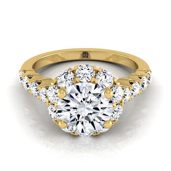 แหวนหมั้นเพชรแบบหนามเตยร่วมทรงกลมเจียระไนแบบบริลเลียนต์สีเหลืองทอง 18K พร้อมฮาโลและเพชรข้างแบบเส้นตรง - 7/8 กะรัตรวม