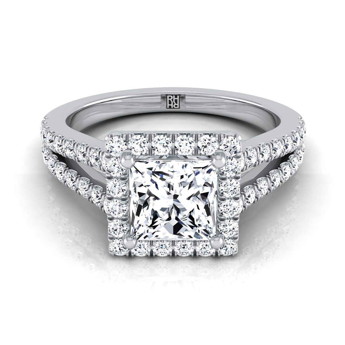 แหวนหมั้นเพชรทรงเจ้าหญิงที่สง่างามนี้พร้อมวงแหวนฮาโลที่มีแถบแยกแบบปาเว่ แสดงให้เห็นถึงเพชรเจียระไนแบบบริลเลียนต์ (h-i/vs 0.50ctw) ที่ประดับในตัวเรือนแพลตตินัม