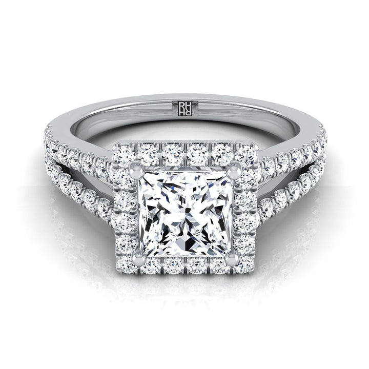 แหวนหมั้นเพชรทรงเจ้าหญิงแพลทินัม แบบแยกช้างและฮาโลว์ประดับเพชรปาเว่ - 1/2ctw