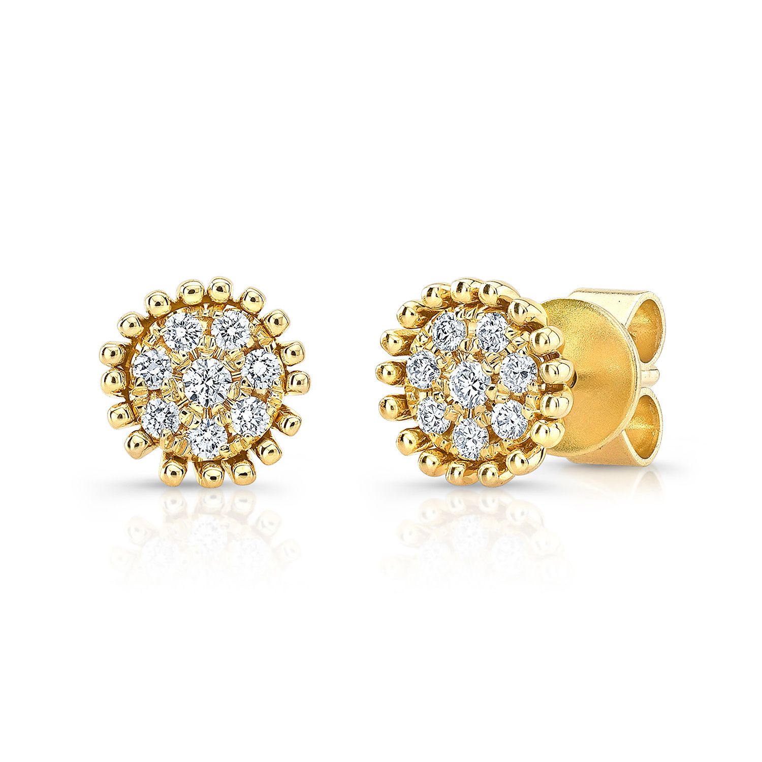 ต่างหูเพชรทรงกลมแบบปาเว่พร้อมขอบประดับเม็ดลูกปัดในทองคำเหลือง 14 กะรัต (1/6 กะรัตรวม)