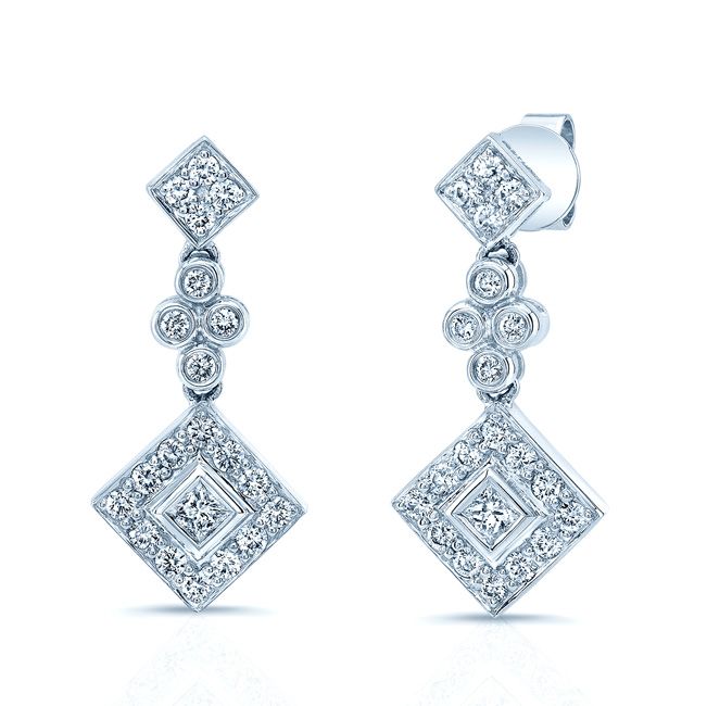 ต่างหูระย้ารูปเพชรเจ้าหญิง/ทรงกลม 14k ทองคำขาว