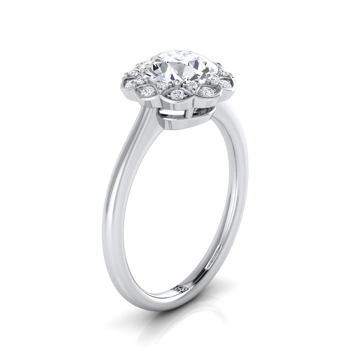 แสดงสไตล์อย่างสง่างาม แหวนหมั้นแบบสกัลลอปฮาโลนี้นำเสนอเพชรเจียระไนแบบบริลเลียนต์ (h-i/vs 0.11ctw) ติดตั้งในตัวเรือนแพลตตินัม