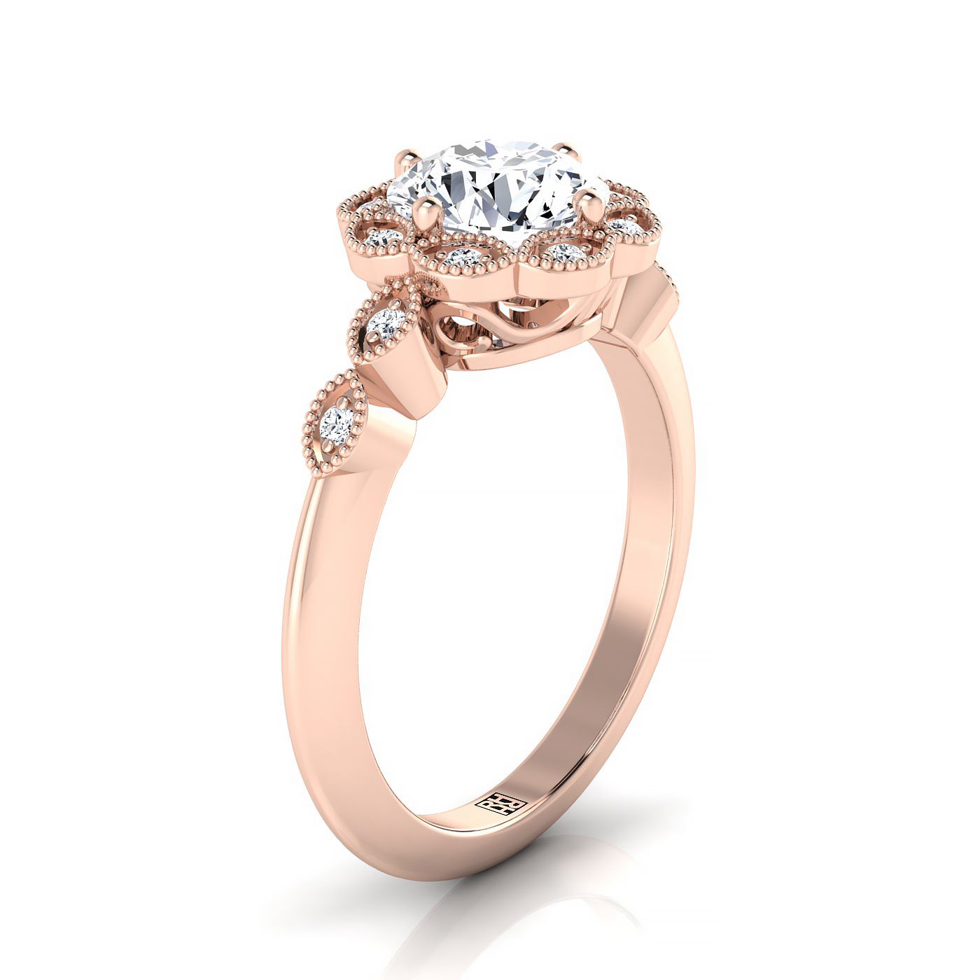 แสดงสไตล์อย่างสง่างาม แหวนหมั้นแบบสกัลลอปฮาโลที่ประดับด้วยเพชรเจียระไนแบบบริลเลียนต์ (h-i/vs 0.10ctw) ติดตั้งในตัวเรือนทองกุหลาบ 14 กะรัต พร้อมไหล่แผ่นใบประดับเม็ดลูกปัด