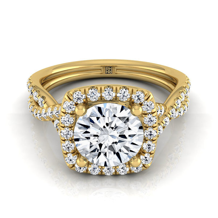 คลาสสิกพร้อมความโดดเด่น แหวนวงนี้มีดีไซน์เพชรทรงสแควร์แบบฮาโลว์พร้อมแหวนชานก้านบิดเกลียวที่แสดงให้เห็นเพชรเจียระไนแบบบริลเลียนต์ (h-i/vs 0.45ctw) ที่ประดับอย่างสวยงามในตัวเรือนทองคำเหลือง 14 กะรัตแบบคลาสสิก