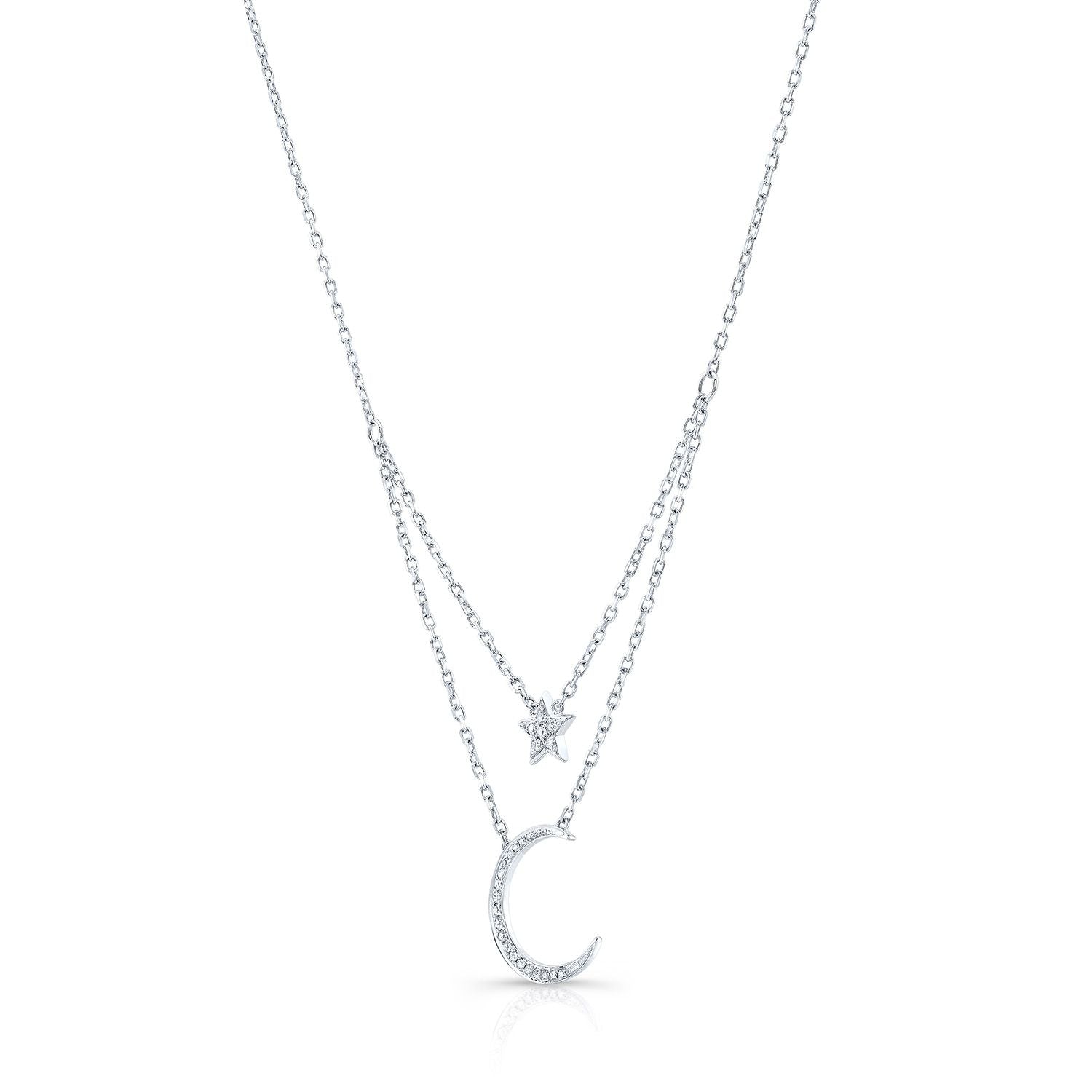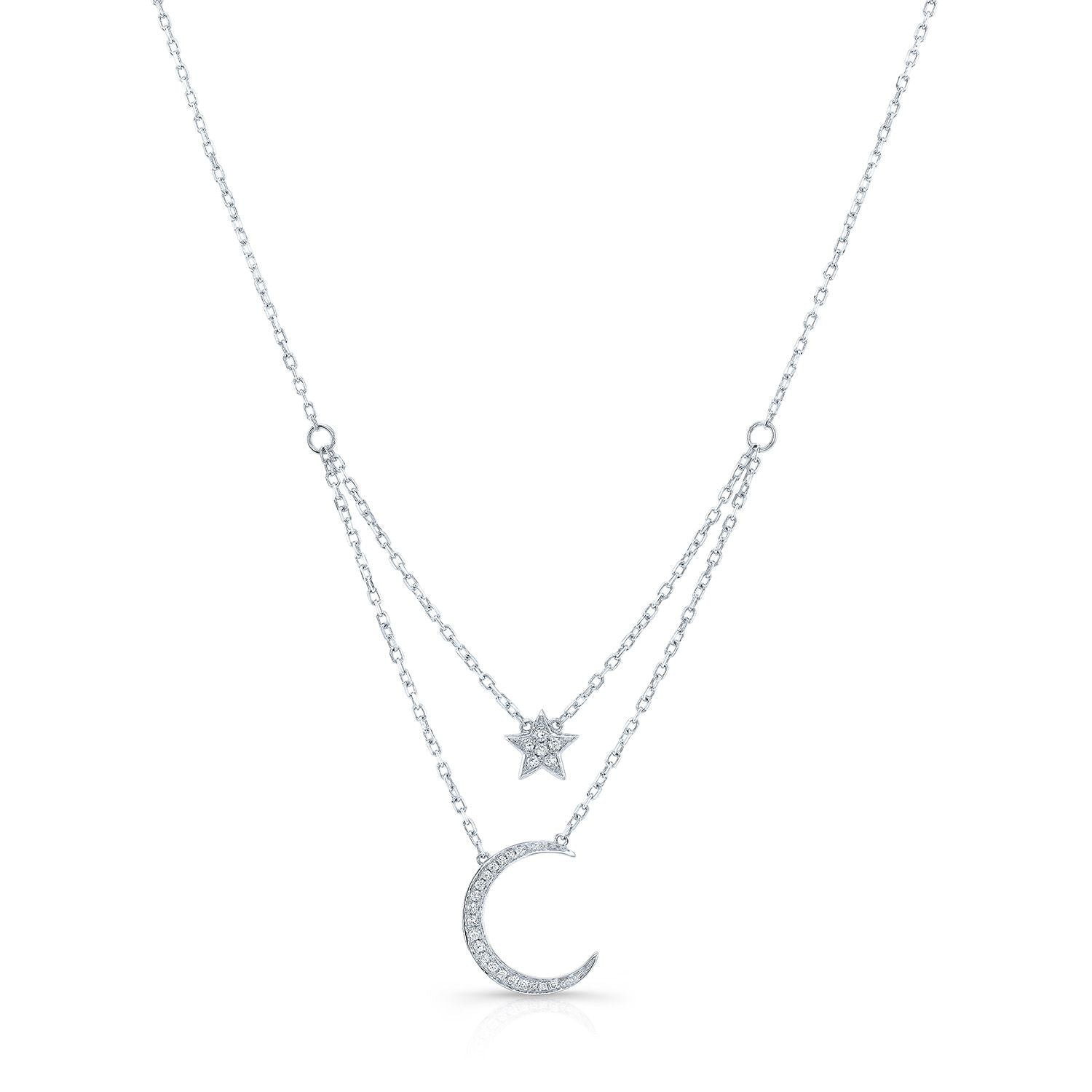 สร้อยคอเลเยอร์รูปดาว เพชร และพระจันทร์ ในทองคำขาว 14k พร้อมสายปรับความยาว 16-18 นิ้ว