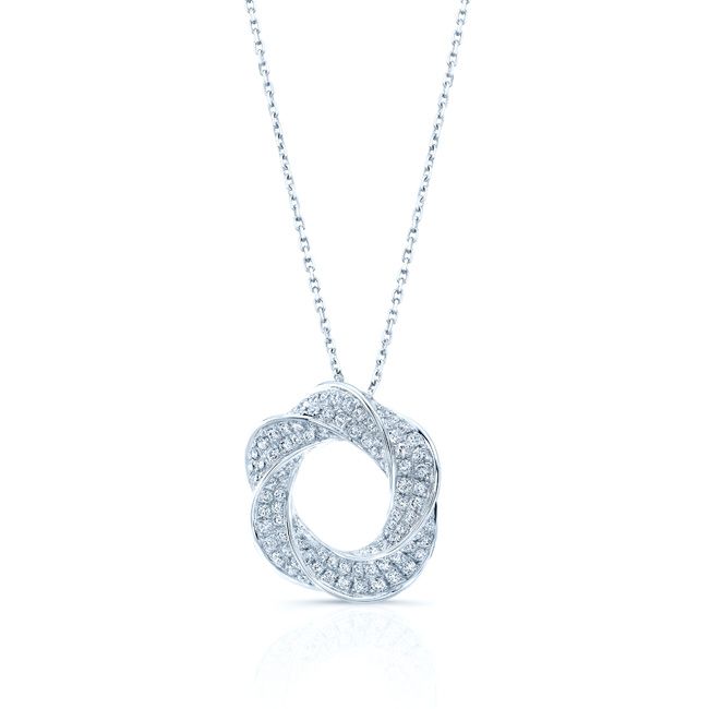 จี้ทองคำขาว 14 กะรัต พร้อมเพชรกลมเจียระไนแบบ Brilliant จำนวน 130 เม็ด น้ำหนักรวม 0.83 กะรัต และสายโซ่ Baby Curb ยาว 18 นิ้ว