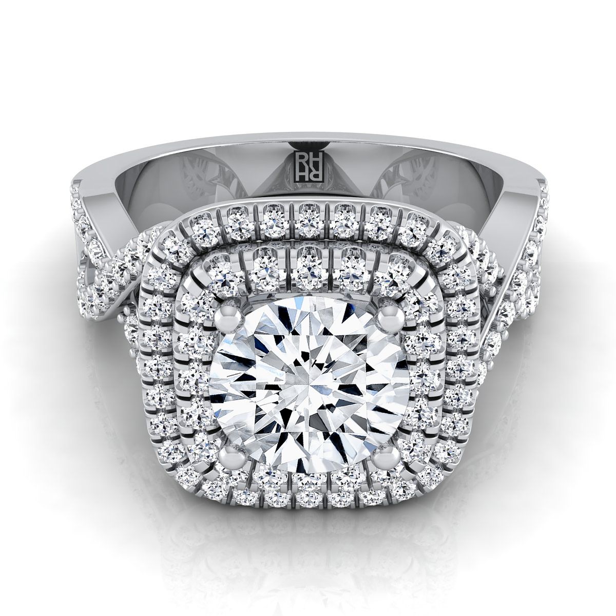 แหวนหมั้นเพชรทรงกลมเจียระไนแบบบริลเลียนต์บิดเกลียวทองคำขาว 14K ฝรั่งเศสประดับเพชรแบบปาเว่สองชั้น - 5/8 กะรัตรวม