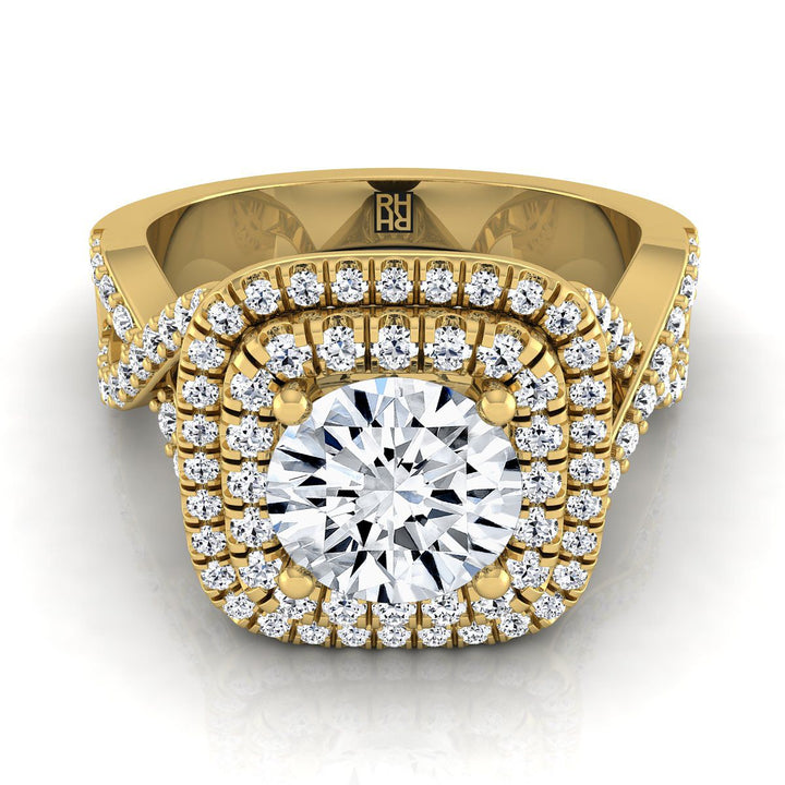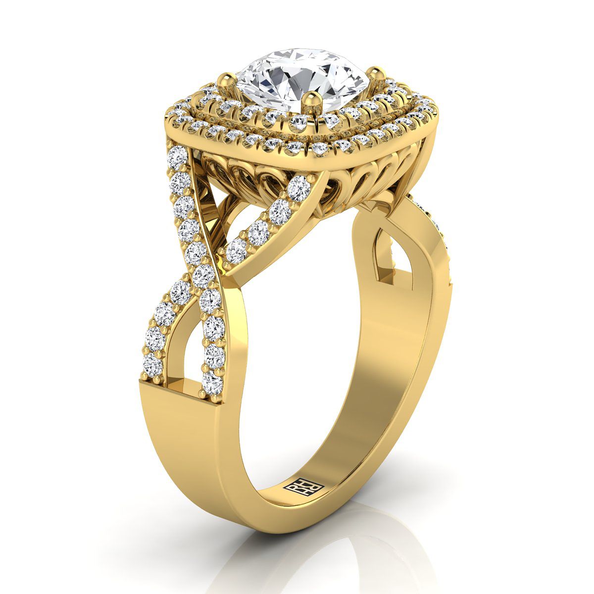 แหวนหมั้นเพชรทรงกลมเจียระไนแบบบริลเลียนต์บิดเกลียวฝรั่งเศสประดับเพชรแบบพาเว่สองชั้นทองคำเหลือง 14K - 5/8ctw
