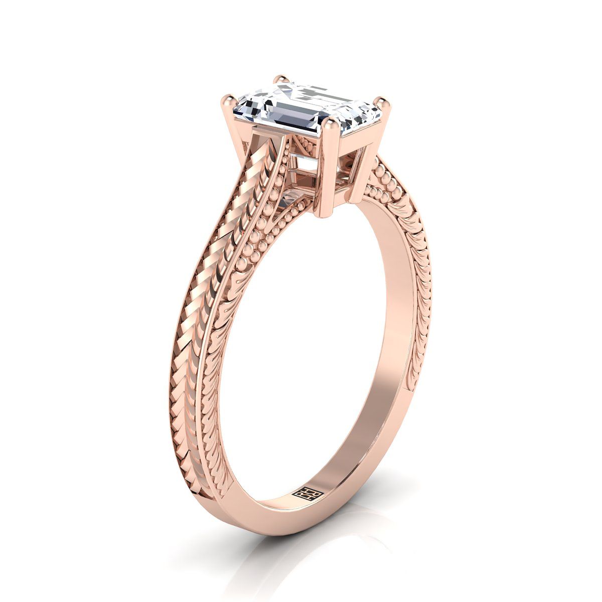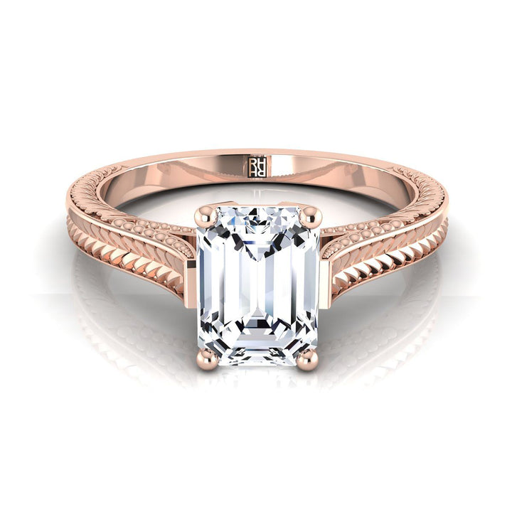 ความสง่างามที่เรียบง่าย แหวนหมั้นเพชรทรงเอมเมอรัลด์นี้นำเสนอการออกแบบที่ได้รับแรงบันดาลใจจากของเก่าที่มีลวดลายสลัก พร้อมการตกแต่งแบบมิลล์เกรนคลาสสิกในทองกุหลาบ 14k