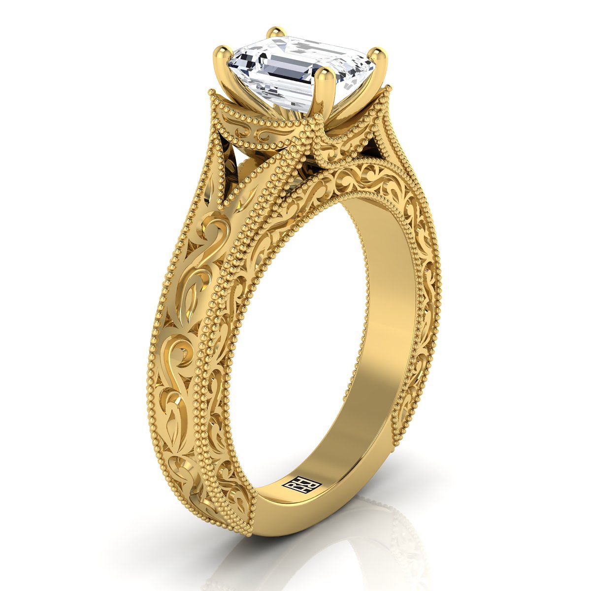 ความสง่างามที่เรียบง่าย แหวนหมั้นเพชรเจียระไนรูปทรงมรกตนี้ในทองคำเหลือง 18 กะรัต แสดงให้เห็นถึงการออกแบบสลักที่ได้รับแรงบันดาลใจจากโบราณพร้อมกับการตกแต่งขอบแบบมิลเกรนคลาสสิก
