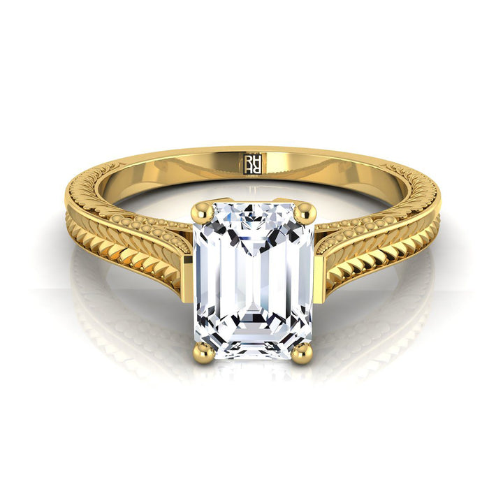 ความสง่างามที่เรียบง่าย แหวนหมั้นเพชรทรงเอเมอรัลด์คัตนี้แสดงให้เห็นถึงการออกแบบสลักลายที่ได้รับแรงบันดาลใจจากโบราณ พร้อมด้วยการตกแต่งมิลเกรนคลาสสิกในทองคำเหลือง 18 กะรัต