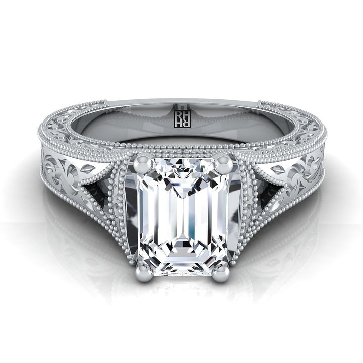 แหวนหมั้นโซลิแทร์วินเทจแบบแกะสลักด้วยมือและมีมิลเกรน ประดับด้วยเพชรแพลทินัมทรงมรกต
