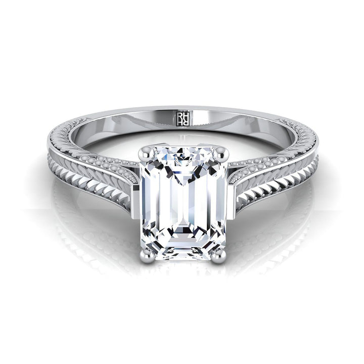 ความสง่างามที่เรียบง่าย แหวนหมั้นเพชรทรงเอเมอรัลด์คัตนี้แสดงให้เห็นถึงการออกแบบสลักลายที่ได้รับแรงบันดาลใจจากโบราณ พร้อมด้วยการตกแต่งมิลเกรนคลาสสิกในแพลทินัม