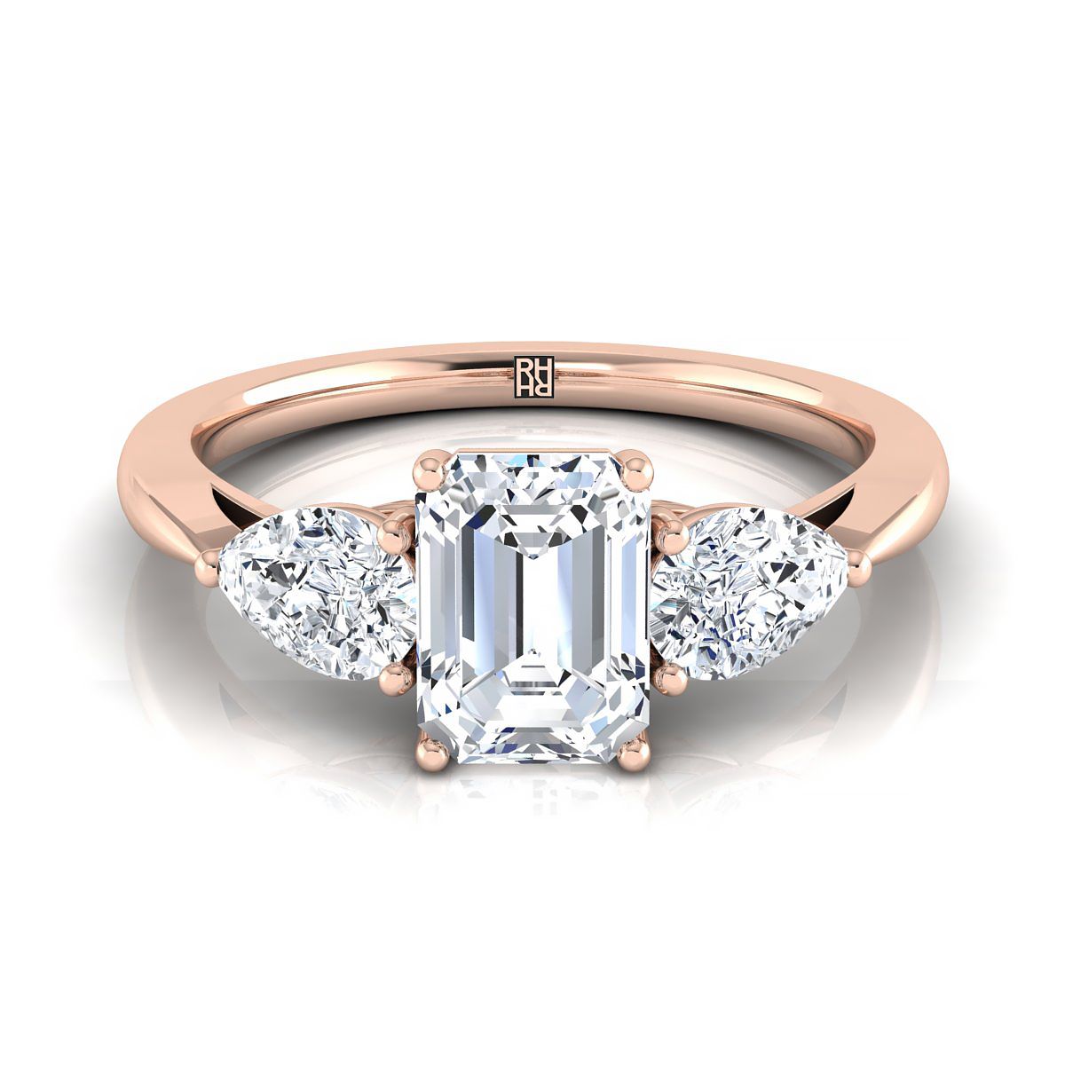 แหวนหมั้นเพชรทรงลูกแพร์สามเม็ดที่ตรงกันอย่างสมบูรณ์แบบ ขนาด 14K สีทองกุหลาบ เพชรทรงสี่เหลี่ยมผืนผ้า -7/8ctw