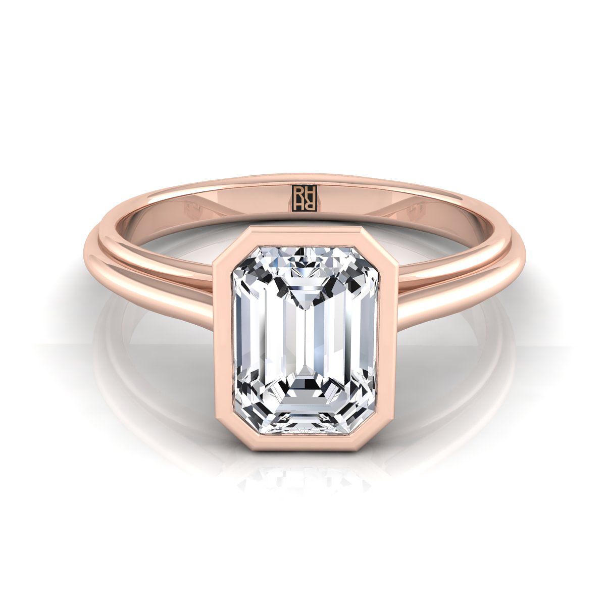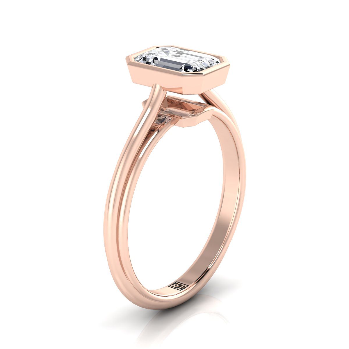 ความสง่างามที่เรียบง่าย แหวนหมั้นเพชรทรงเอมเมอรัลด์นี้มีเพชรเดี่ยวที่ตั้งอยู่ในกรอบแบบเบเซลในกรอบทองกุหลาบ 14k คลาสสิก