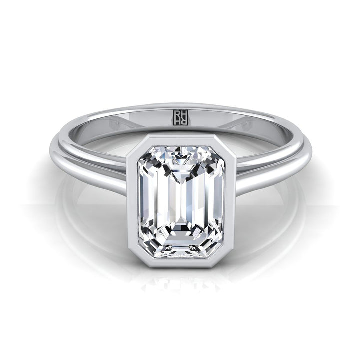 ความสง่างามที่เรียบง่าย, แหวนหมั้นเพชรทรงเอเมอรัลด์คัตนี้แสดงให้เห็นเพชรโซลิแทร์ที่ตั้งด้วยขอบในตัวเรือนทองคำขาว 14 กะรัตคลาสสิก.