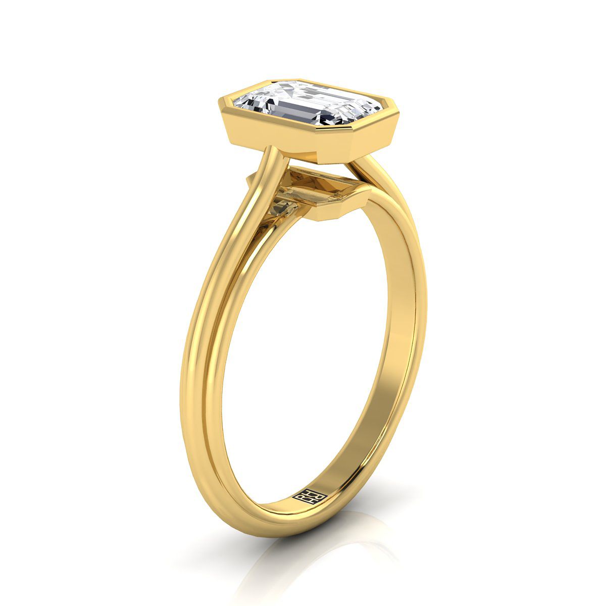 ความสง่างามที่เรียบง่าย, แหวนหมั้นเพชรทรงเอเมอรัลด์คัตนี้แสดงให้เห็นเพชรโซลิแทร์ที่ตั้งด้วยขอบในตัวเรือนทองคำเหลือง 14 กะรัตคลาสสิก.