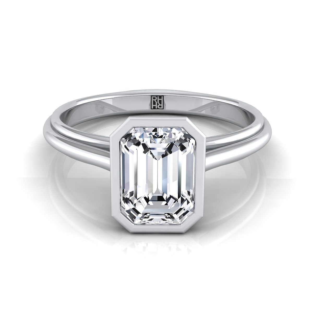 ความสง่างามที่เรียบง่าย, แหวนหมั้นเพชรทรงเอเมอรัลด์คัตนี้แสดงให้เห็นเพชรโซลิแทร์ที่ตั้งด้วยขอบในตัวเรือนแพลตตินัมคลาสสิก.