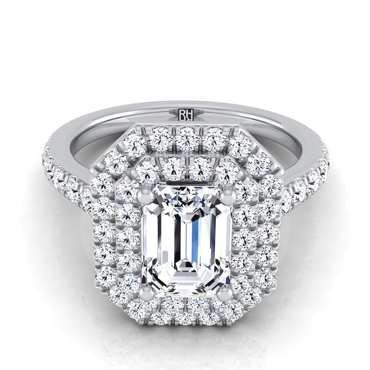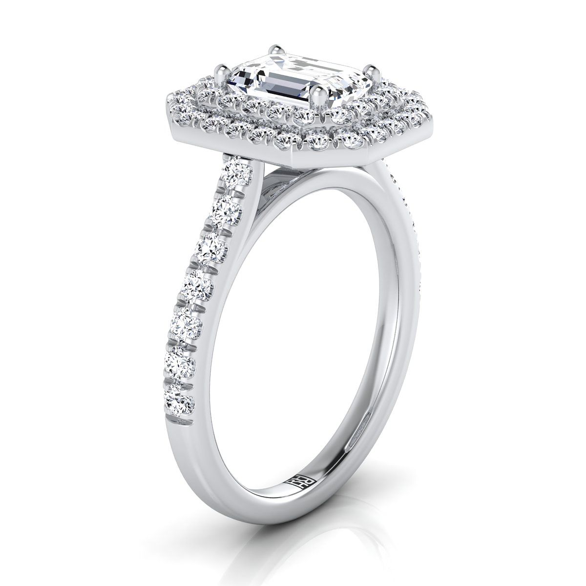 แหวนหมั้นแบบฮาโลว์คัทมรกตคู่ที่ทำด้วยมืออย่างประณีตนี้ โชว์เพชรเจียระไนแบบบริลเลียนท์คัท (h-i/vs 0.80 Ctw) ที่ประดับอย่างสวยงามในตัวเรือนทองคำขาว 14 กะรัตแบบคลาสสิก