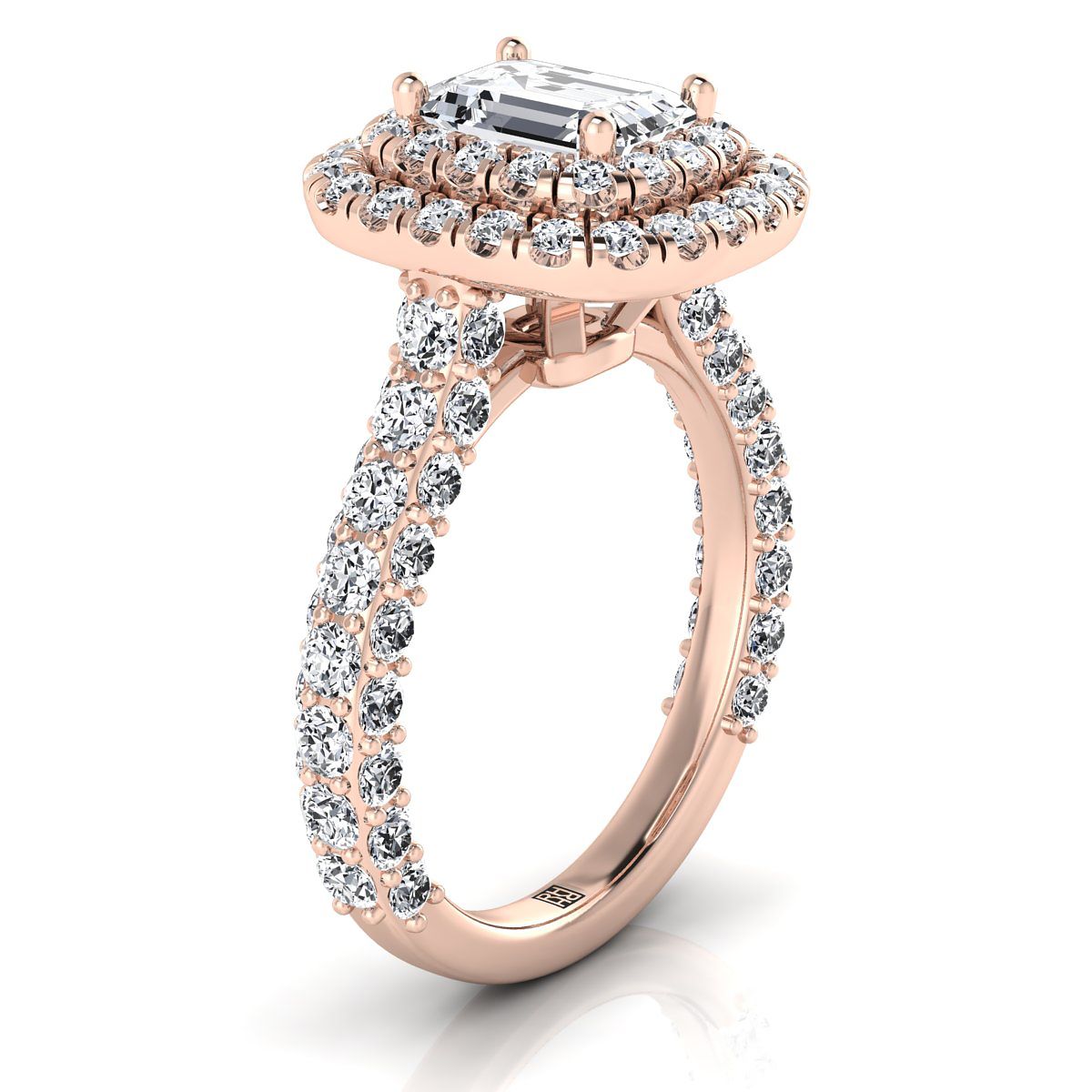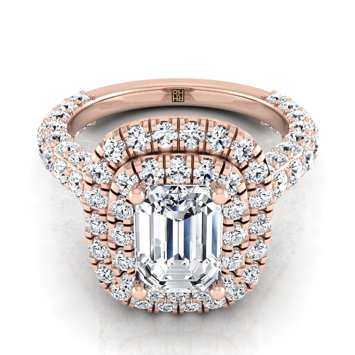 แถลงการณ์ที่สง่างามของสไตล์ แหวนหมั้นแบบดับเบิลฮาโล่ที่มีการเจียระไนแบบเอเมอรัลด์นี้มีเพชรเจียระไนแบบสวยงาม (h-i/vs 2.15ctw) พร้อมกับแชงค์ปูที่ประณีตติดตั้งในเซ็ตติ้งทองกุหลาบ 14k.