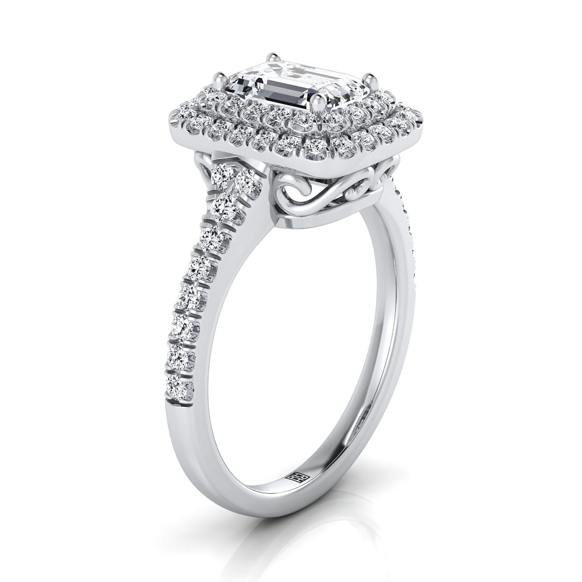 แสดงออกถึงสไตล์ที่สง่างาม แหวนหมั้นแบบดับเบิลฮาโลเอมเมอรัลด์คัตนี้นำเสนอเพชรเจียระไนแบบบริลเลียนต์คัต (h-i/vs 0.50ctw) พร้อมกับแถบเพชรแบบเพฟที่ประณีต ติดตั้งในตัวเรือนทองคำขาว 14 กะรัต