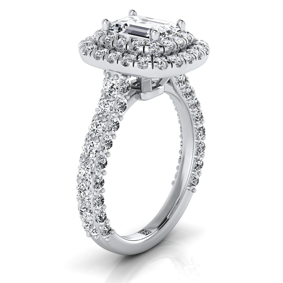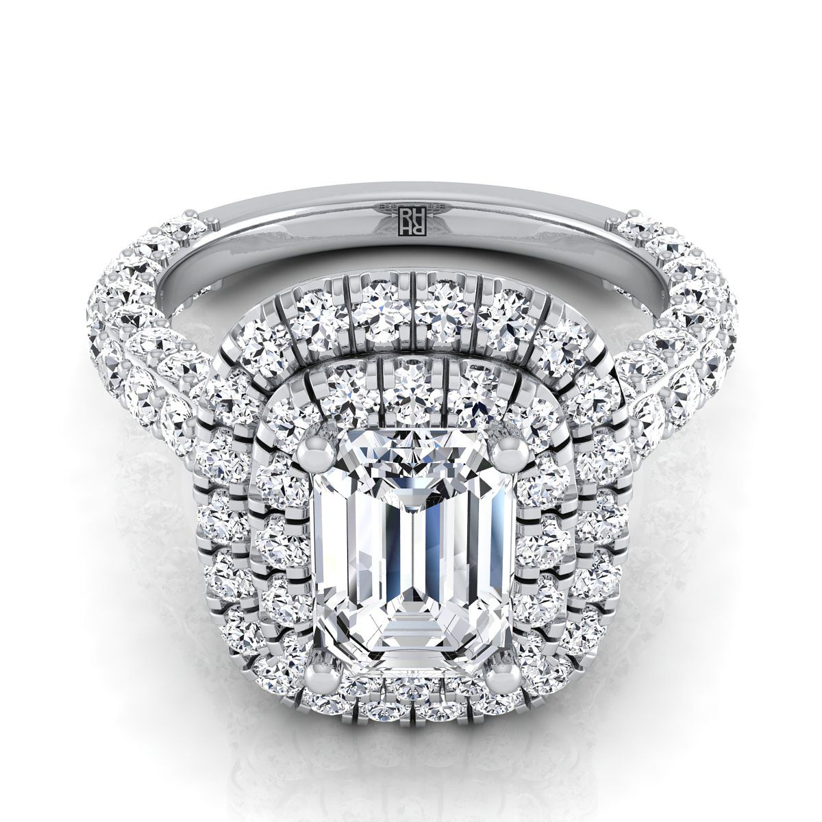 แสดงออกถึงสไตล์ที่สง่างาม แหวนหมั้นแบบดับเบิลฮาโลว์ทรงเอเมอรัลด์คัตนี้นำเสนอเพชรเจียระไนแบบบริลเลียนท์คัต (h-i/vs 2.15ctw) พร้อมกับแถบเพฟที่ประณีต ติดตั้งในตัวเรือนทองคำขาว 14 กะรัต