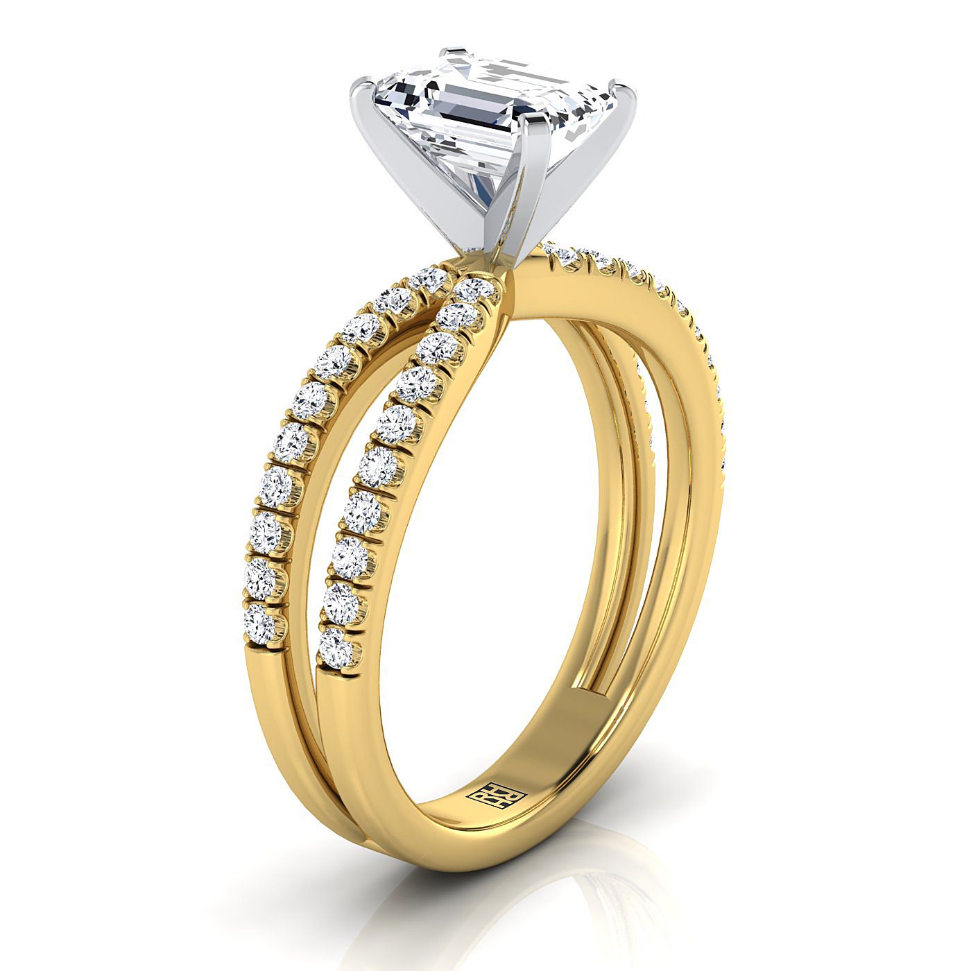 แหวนหมั้นเพชรเม็ดกลางทรงเอเมอรัลด์คลาสสิกพร้อมชิ้นแยกแบบพาฟเว่ แสดงให้เห็นเพชรเจียระไนแบบบริลเลียนท์ (h-i/vs 0.35ctw) ที่ตั้งอย่างสวยงามในตัวเรือนทองคำเหลือง 18k คลาสสิก
