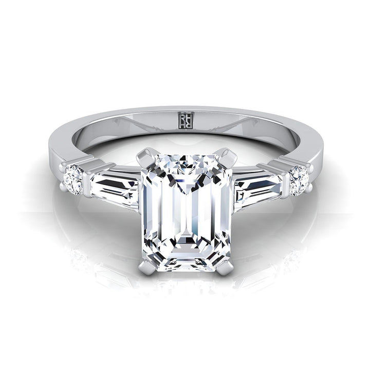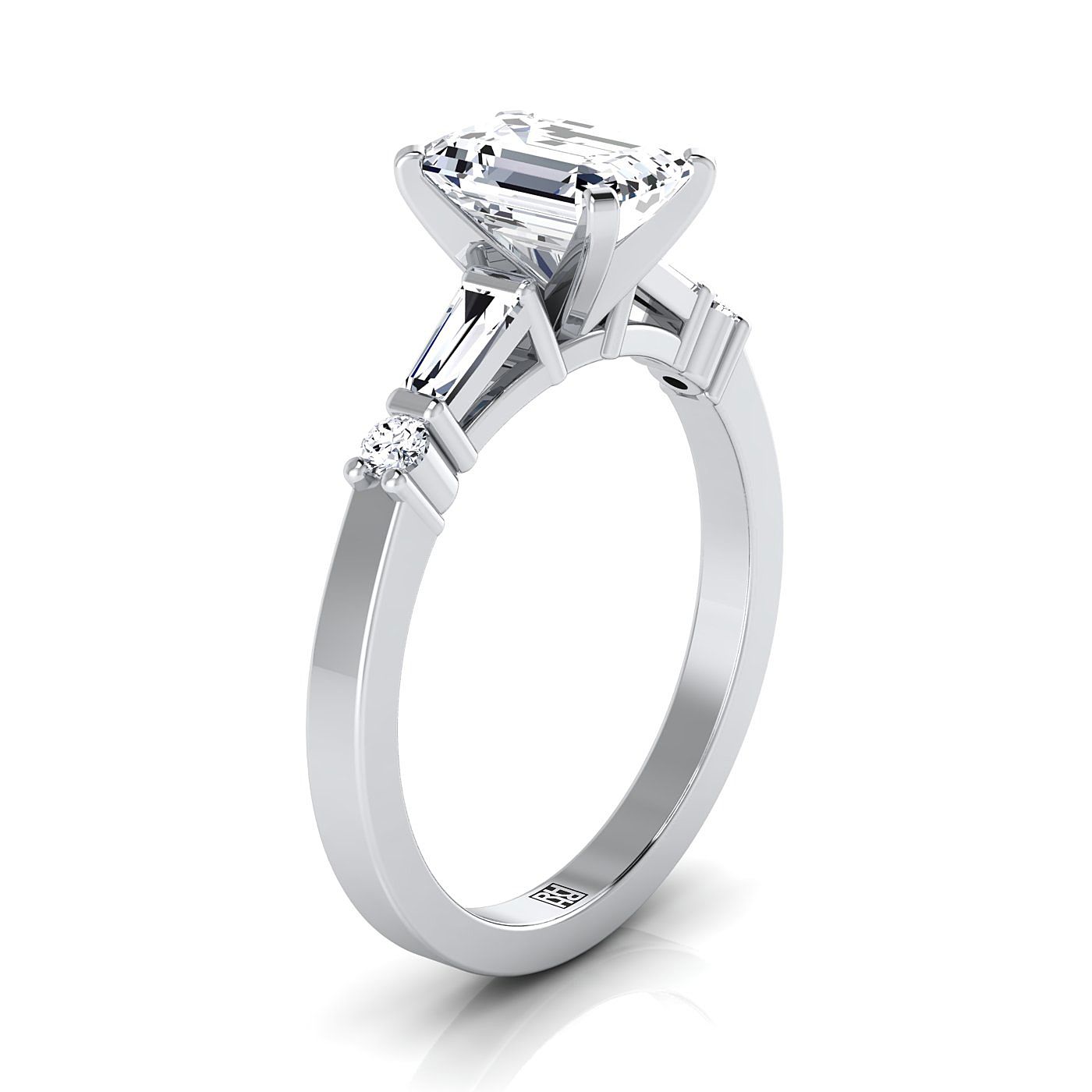 แหวนหมั้นเพชรคลาสสิกที่โดดเด่นด้วยเพชรทรงมรกตตรงกลาง พร้อมด้วยเพชรบาเก็ตทรงเรียวและเพชรเจียระไนแบบบริลเลียนท์ (h-i/vs 0.25 Ctw) ประดับอย่างสวยงามด้วยการฝังแบบแชนแนลและกรงเล็บในทองคำขาว 14 กะรัต