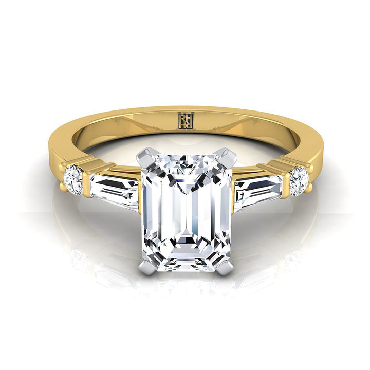 แหวนหมั้นเพชรคลาสสิกที่มีเพชรทรงมรกตตรงกลาง โดดเด่นด้วยเพชรบาเก็ตทรงเรียวและเพชรเจียระไนแบบบริลเลียนต์ (h-i/vs 0.25 Ctw) ประดับอย่างสวยงามด้วยการฝังแบบแชนแนลและกรงเล็บในทองคำ 18 กะรัตสีเหลือง