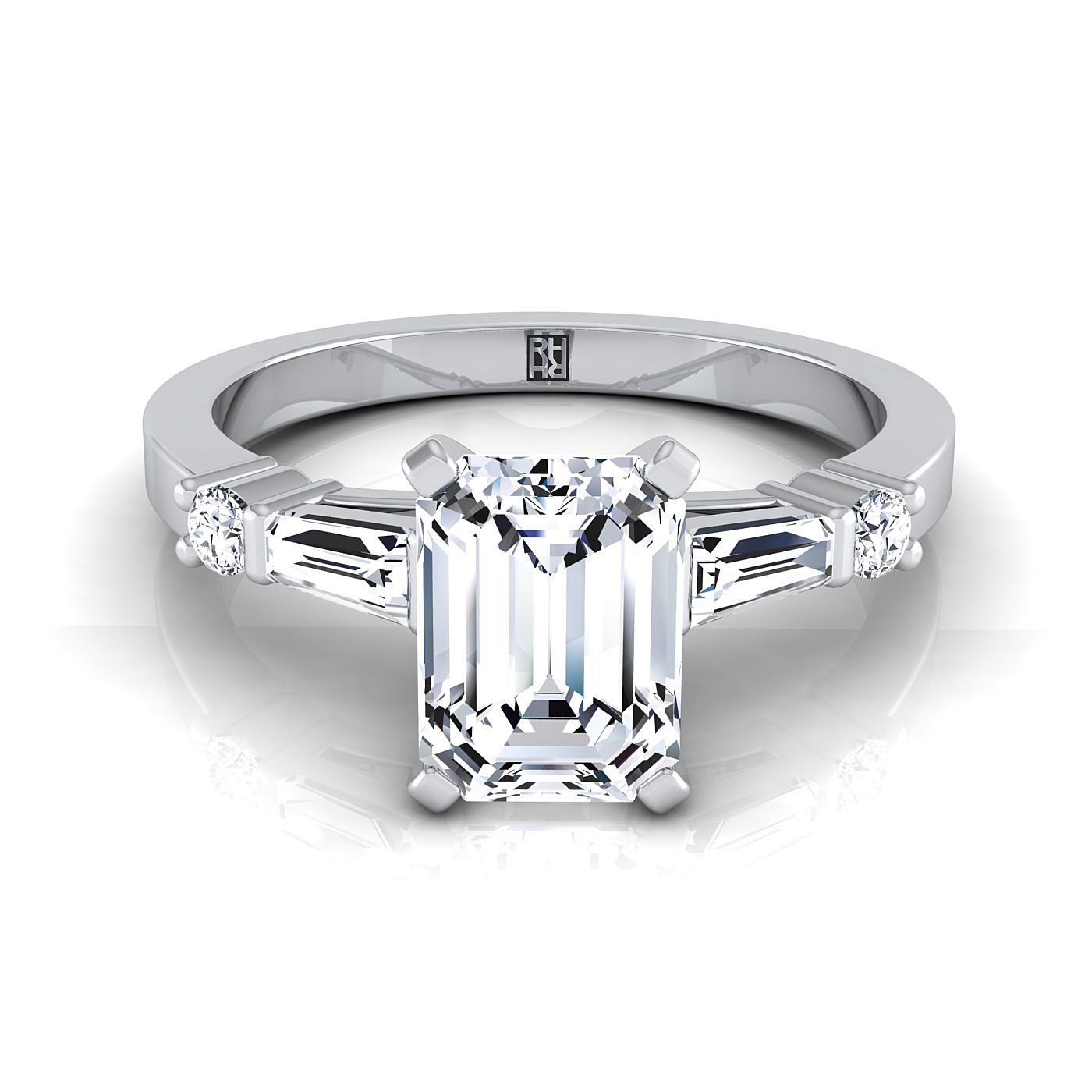 แหวนหมั้นเพชรคลาสสิกที่มีเพชรทรงมรกตตรงกลาง เน้นด้วยเพชรบาเก็ตทรงเรียวและเพชรเจียระไนแบบบริลเลียนต์ (h-i/vs 0.25 Ctw) ประดับอย่างสวยงามด้วยการฝังแบบแชนเนลและกรงเล็บในแพลตตินัม