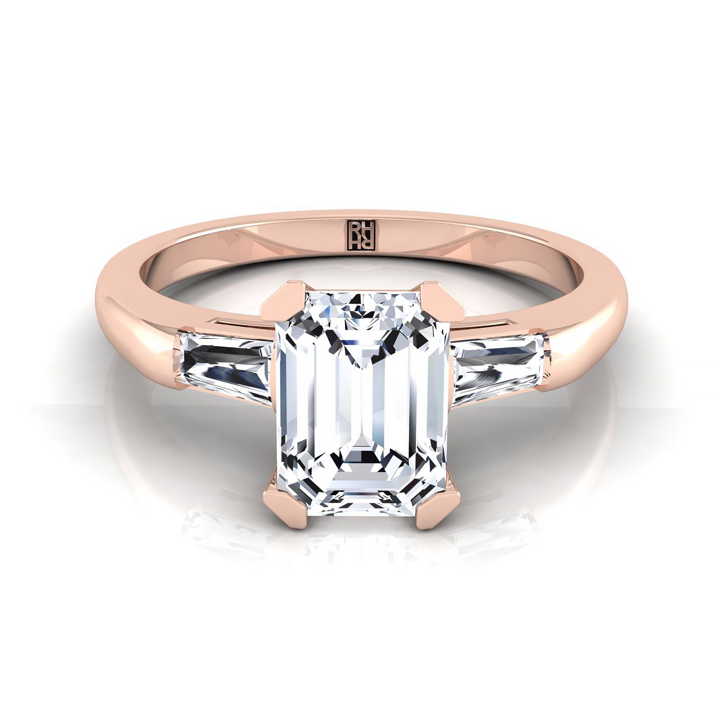 แหวนหมั้นเพชรทรงเอมเมอรัลด์คลาสสิกที่โดดเด่นด้วยเพชรบากูเอตที่เรียว (h-i/vs 0.18 Ctw) ตั้งอยู่ในทองคำกุหลาบ 14k อย่างสวยงาม