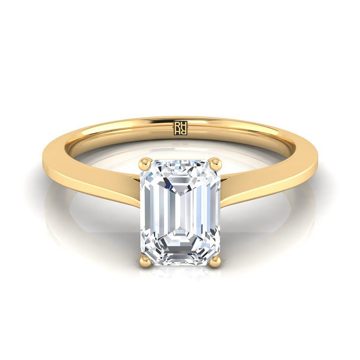 ความสง่างามที่เรียบง่าย แหวนหมั้นเพชรทรงเอเมอรัลด์คัตนี้แสดงให้เห็นถึงแถบขอบเอียงแบบขั้นบันไดพร้อมการตั้งแบบวิหารในทองคำเหลือง 18 กะรัต