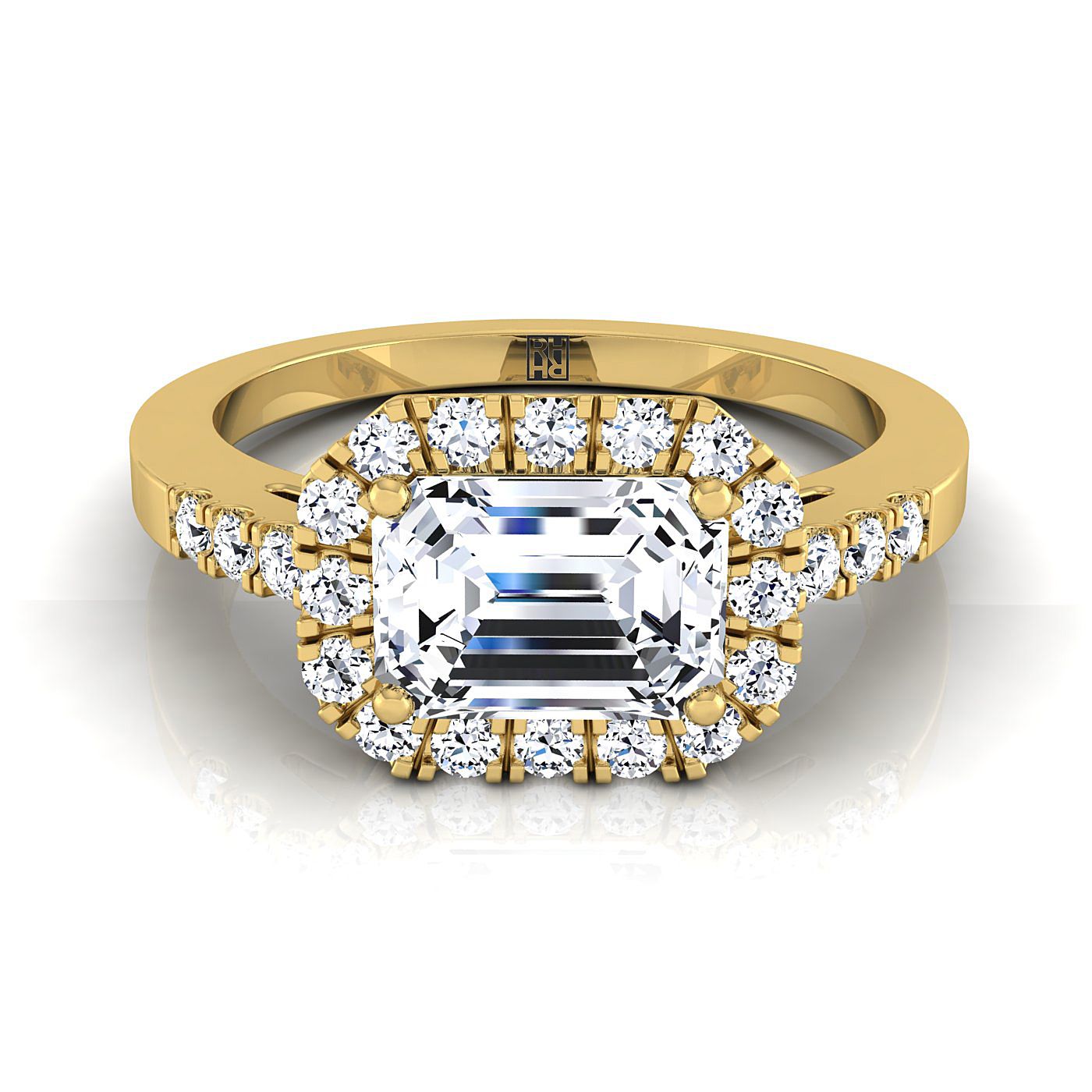 แหวนหมั้นแบบฮาโลว์แนวนอนรูปสี่เหลี่ยมผืนผ้าประดับเพชรทรงมรกตทองคำเหลือง 14K - 1/3 กะรัต