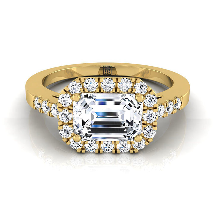 คลาสสิกและสง่างาม แหวนหมั้นเพชรทรงเอเมอรัลด์คัทแบบฮาโล (แนวตะวันออก-ตะวันตก) พร้อมช้างค์แบบปาเว่ โชว์เพชรเจียระไนแบบบริลเลียนต์ (h-i/vs 0.30 กะรัตรวม) ที่ประดับอย่างสวยงามในตัวเรือนทองคำ 14 กะรัตสีเหลืองคลาสสิก