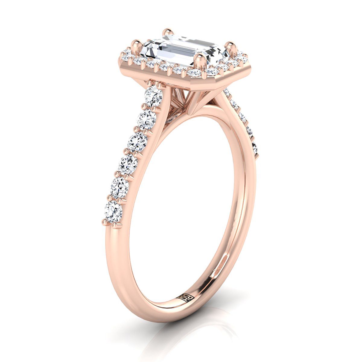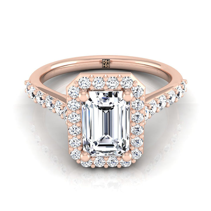 แหวนหมั้นทองคำชมพู 14K ประดับเพชรทรงสี่เหลี่ยมผืนผ้าแบบแชร์พร็องก์ พร้อมฮาโลและปาเว่ฝรั่งเศส -1/2ctw