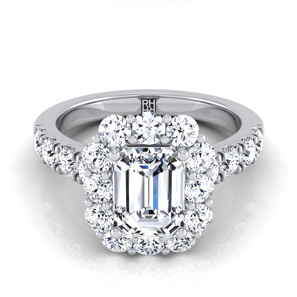 แหวนหมั้นสไตล์หรูฝรั่งเศสประดับเพชรทรงมรกตเจียระไน 18K ทองคำขาว พร้อมฮาโลพาเว่ -1-1/10ctw