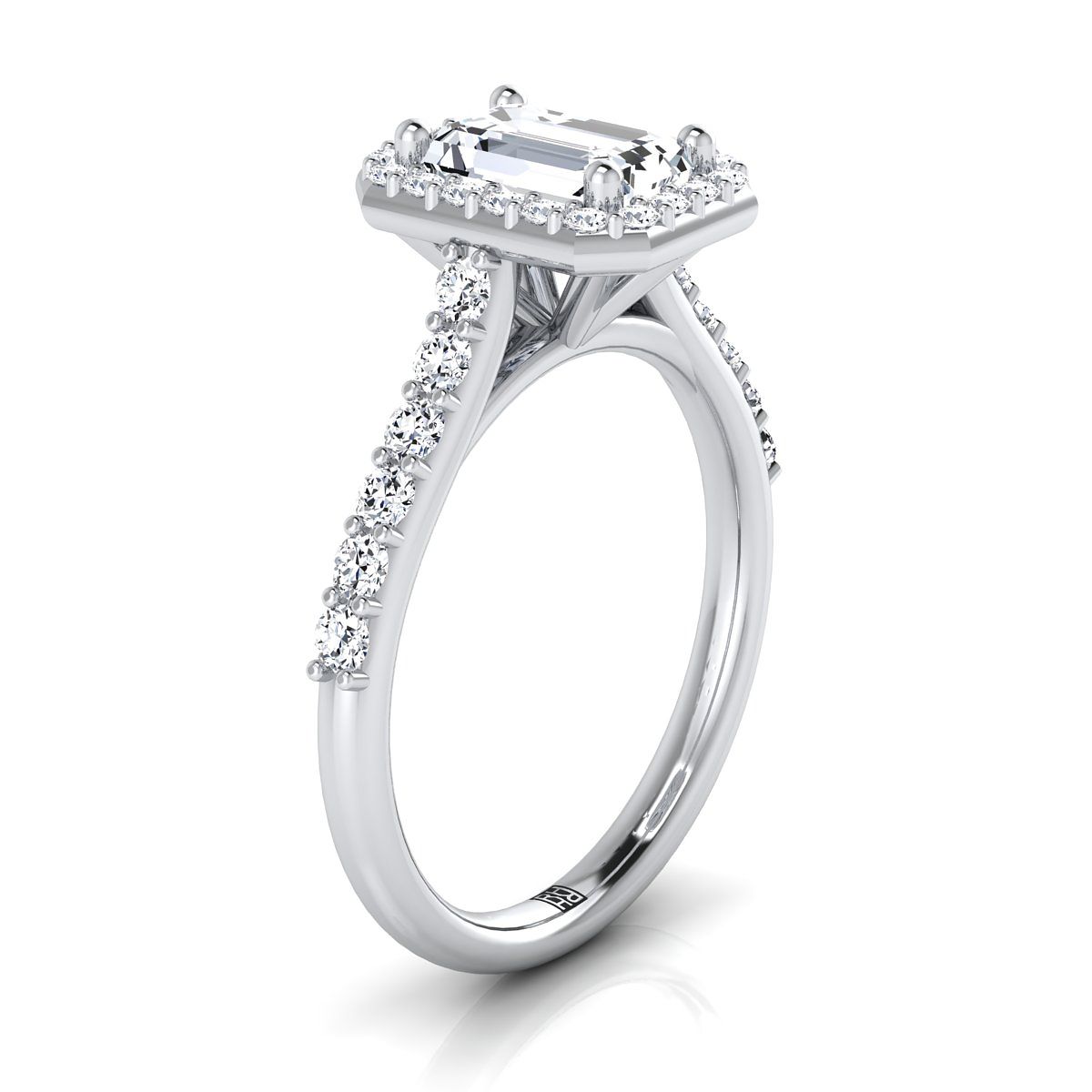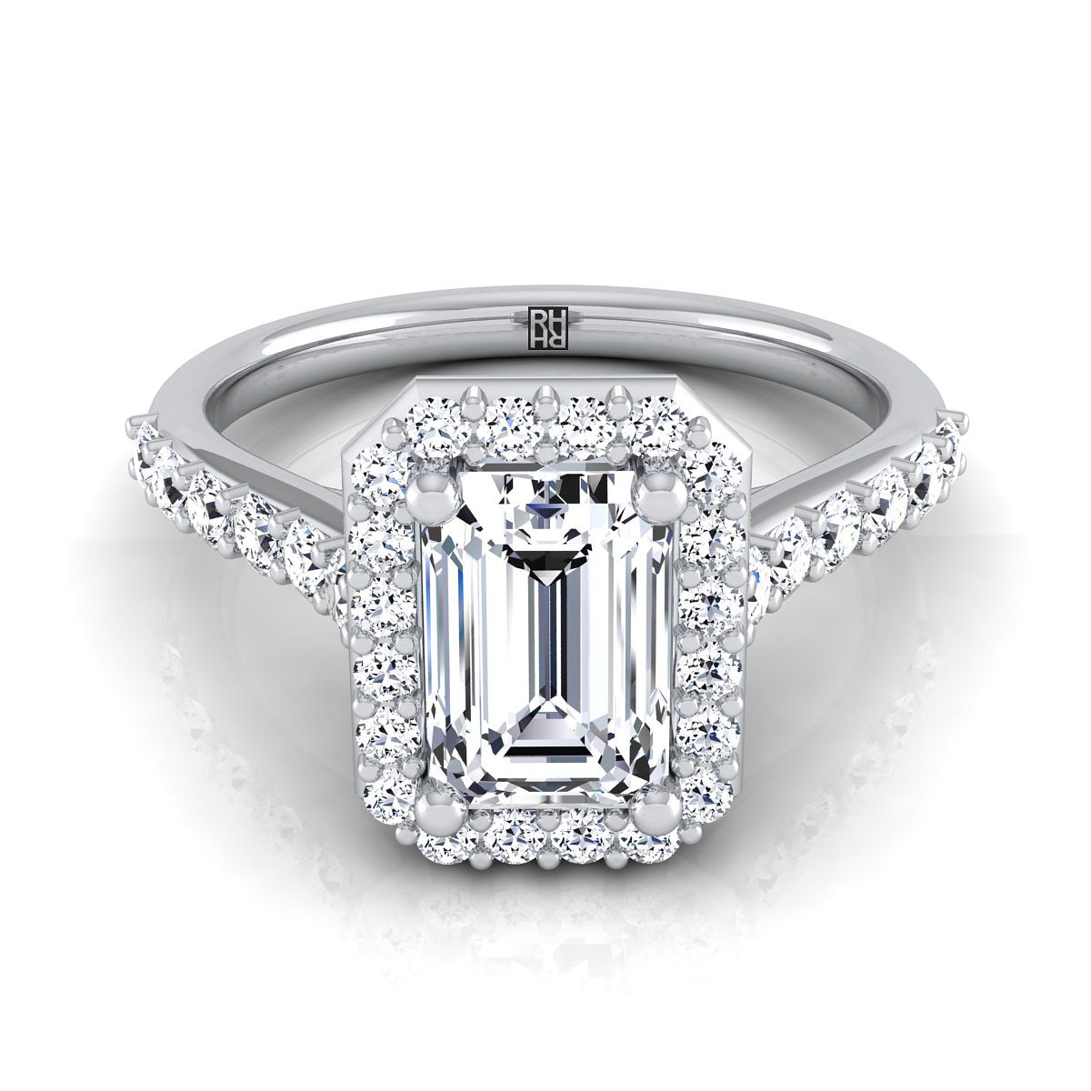 แหวนหมั้นเพชรทรงมรกตแพลทินัมแบบหนามเตยร่วมพร้อมฮาโลแบบฝรั่งเศสปาเว่ - 1/2ctw