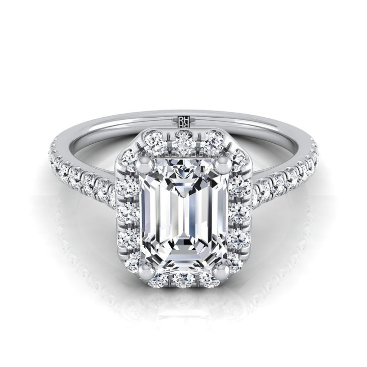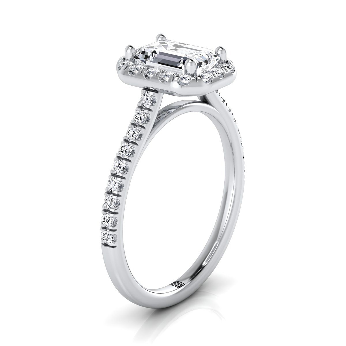แสดงสไตล์อย่างสง่างาม แหวนหมั้นทรงเอเมอรัลด์คัทแบบฮาโลนี้พร้อมชิ้นส่วนเพชรปาเว่บนแหวนโชว์เพชรเจียระไนแบบบริลเลียนท์คัท (h-i/vs 0.40ctw) ที่ประดับอย่างสวยงามในตัวเรือนแพลตตินัมคลาสสิก