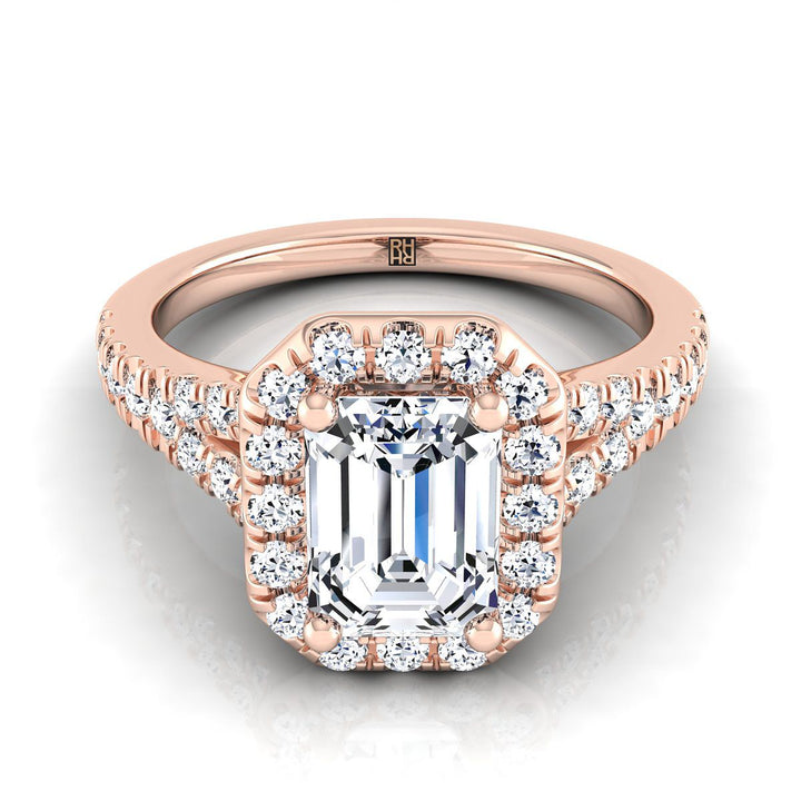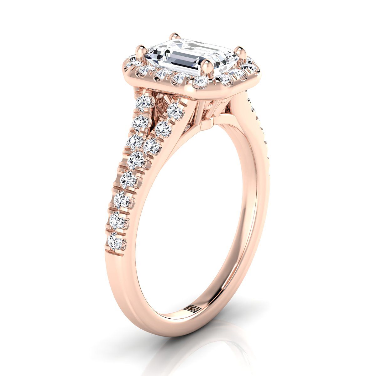แถลงการณ์ที่สง่างามของสไตล์ แหวนหมั้นแบบฮาโล่ตัดเอเมอรัลด์นี้มีเพชรตัดสวย (h-i/vs 0.50ctw) พร้อมกับขาแยกปูที่ประณีตติดตั้งในเซ็ตติ้งทองกุหลาบ 14k