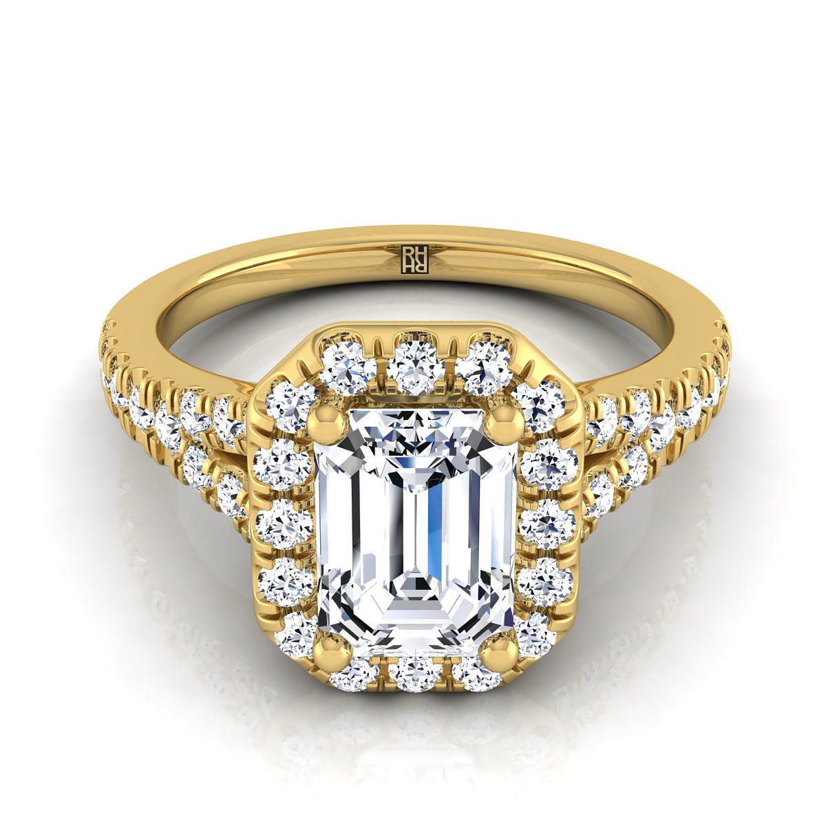 แสดงสไตล์อย่างสง่างาม แหวนหมั้นแบบเอเมอรัลด์คัทฮาโลพาเว่ใบนี้นำเสนอเพชรเจียระไนแบบบริลเลียนต์คัท (h-i/vs 0.50ctw) พร้อมกับชิ้นงานพาเว่แยกชิ้นที่ประณีต ติดตั้งในตัวเรือนทองคำ 18k สีเหลือง