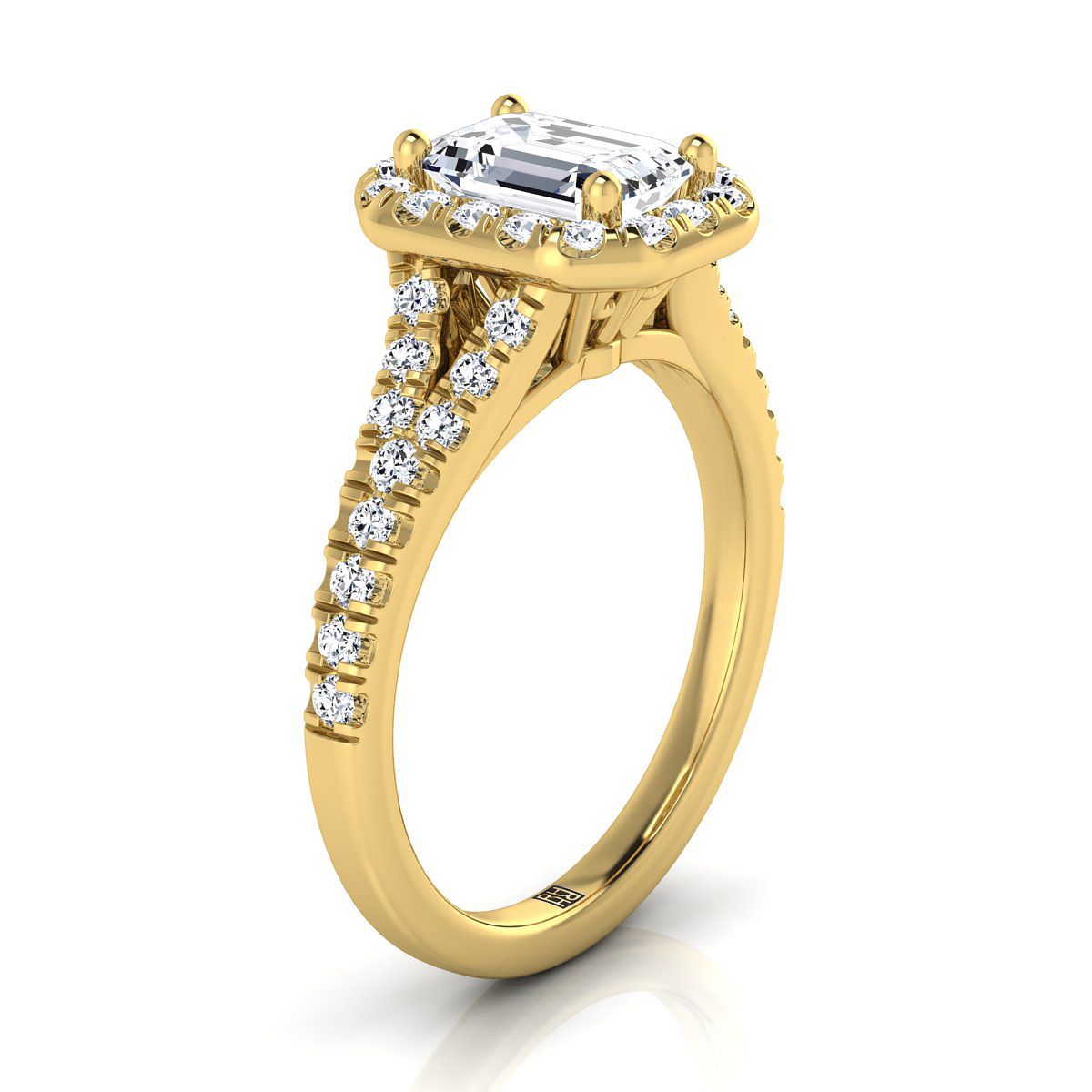 แหวนหมั้นเพชรทรงสี่เหลี่ยมมรกตทองคำเหลือง 18K แบบหนามเตยเรียบพร้อมฮาโลและแถบแยกเล็กประดับเพชร 1/2ctw