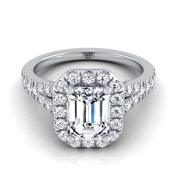 แหวนหมั้นเพชรทรงมรกตแพลทินัมแบบหนามเตยเรียบพร้อมฮาโลและแถบแยกเล็กประดับเพชรปาเว่ - 1/2ctw